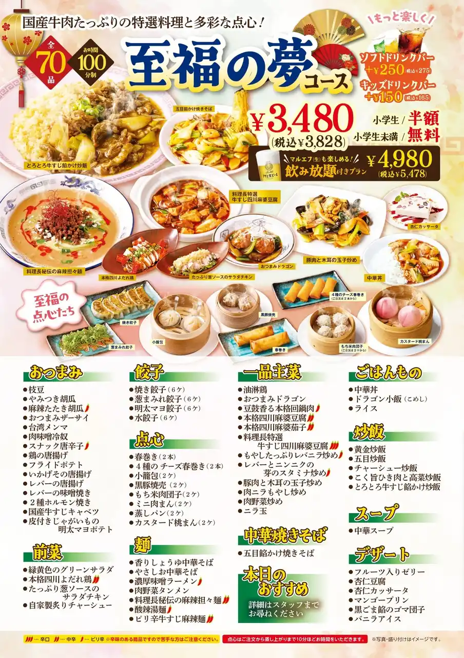 株式会社サリックストラベル(本社:埼玉県さいたま市、代表取締役社長:柳 朱理)が運営する中華料理店「肉中華BAKU」では2025年11月25日(月)から、2580円(税込2838円)より3種類の中華料理食べ放題コース「夢 食べ放題」の提供をスタートします。(小学生半額、小学生未満無料、65歳以上税込550円引き) |