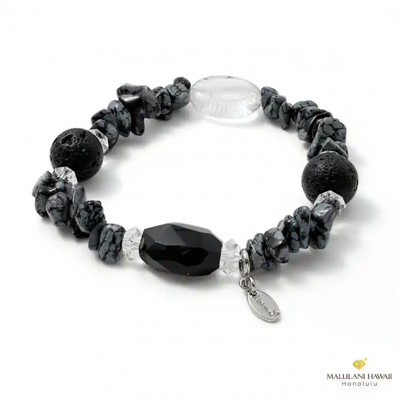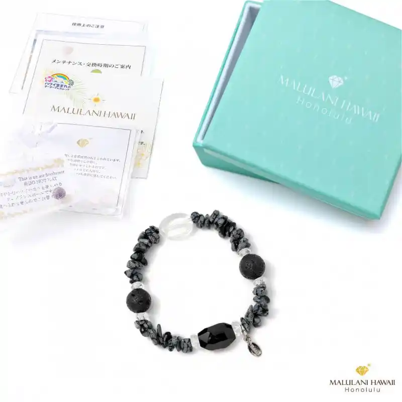 スノーフレークやラバストーンの個性豊かな表情は、シンプルながらもおしゃれのポイントとしても魅力。厄除けや仕事運のお守りとしてもおすすめです。 |