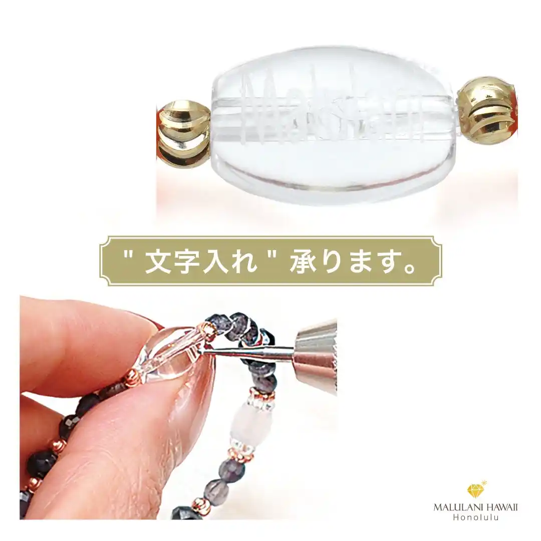 水晶には、Malulaniの文字の裏面に、お好きな英数字を6文字まで刻むことも可能。(+2,200円) お名前やイニシャル、お好きな数字を刻んだブレスレットは、特別なお守りとなるでしょう。 |
