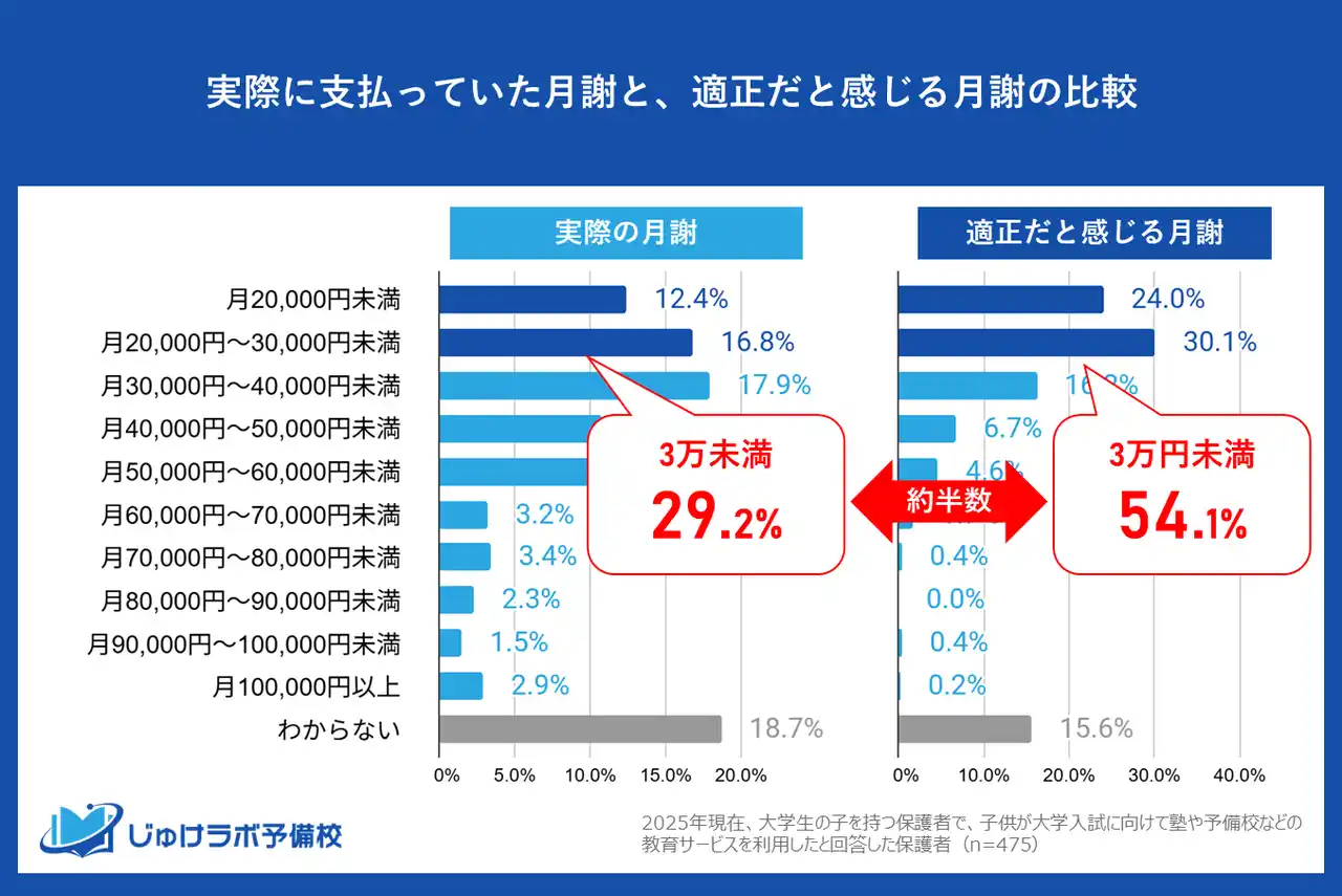 【理想と現実の壁】月謝「3万円未満」を過半数(54.1%)が望むも、実際の支払いは29.2%。理想との大きな乖離が浮き彫りに |