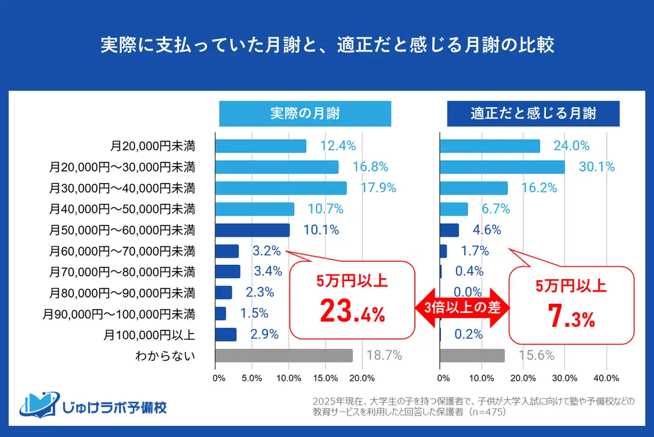 大学受験における教育費の高額化は、一部の家庭にとって特に深刻な問題です。今回の調査で、月5万円以上の月謝を「安い、または適正だ」と考える保護者は、全体のわずか7.3%しかいませんでした。 |