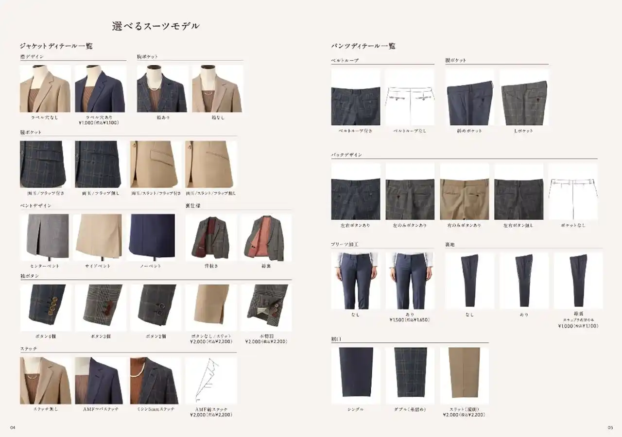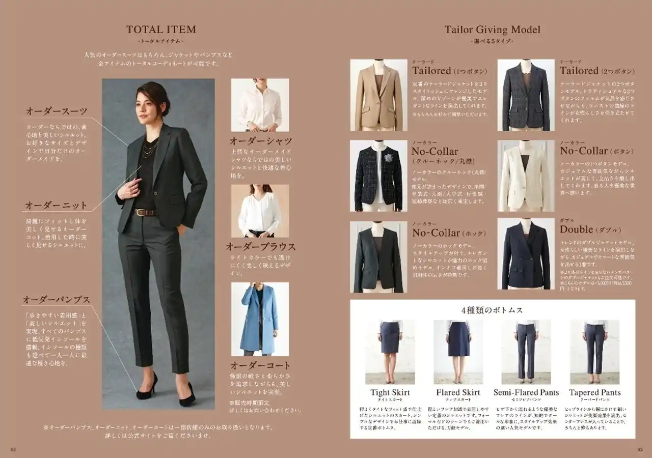 新しいパンフレットには、新登場したばかりの「オーダーブラウス」や選べるスーツモデルなどについて情報をアップデートしております。またコーディネートの画像も新作生地を使ったオーダースーツに更新いたしました。お客様のスタイルをより豊かにするアイテムを取り揃え、スーツ選びを一層楽しんでいただける内容となっています。 |