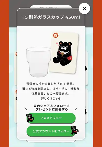 | 公式ページより、福熊くんの神経衰弱ゲームに参加することで、福熊くんのカードを獲得できます。ゲームを通して、台湾エクセレンスに選ばれた高品質な商品を知っていただくことができます。獲得したカードをSNSでシェアすることで、プレゼントキャンペーンに参加できます。参加者には抽選で、台湾エクセレンス賞を獲得した商品がプレゼントされます。 | |||||||||||||||||||