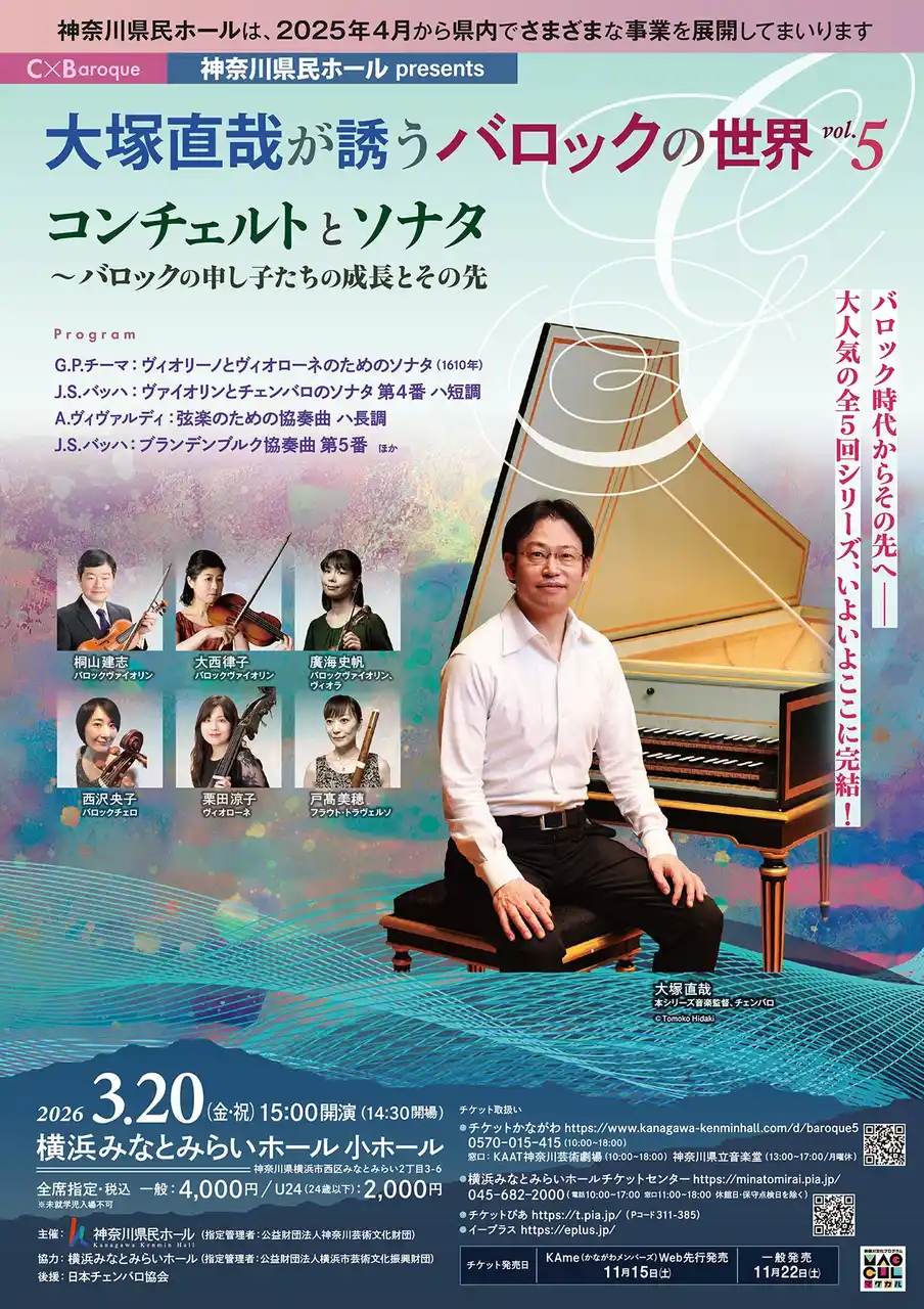 神奈川県民ホールが日本を代表するチェンバロ、オルガン、クラヴィコード奏者・大塚直哉と多彩なゲストを迎え、150年に渡るバロック音楽の歴史を辿ってきた大人気シリーズ「C×Baroque(シー・バイ・バロック)」。最終回である第5回は、建て替えによる休館中の神奈川県民ホールから横浜みなとみらいホールに舞台を移し、バロック時代に確立された「コンチェルト」と「ソナタ」をテーマとして華やかに締めくくります。 |