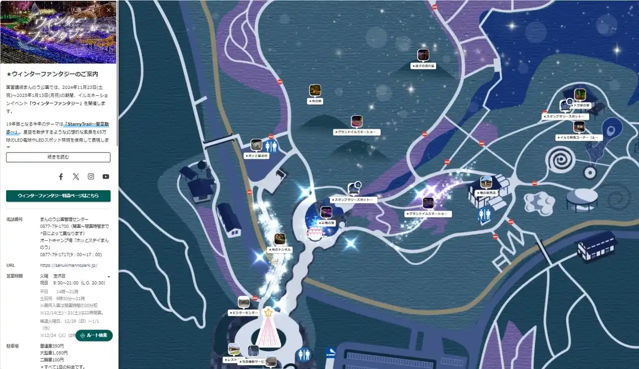 お手持ちのスマートフォンで使えるまんのう公園のデジタルマップに夜に便利なイルミネーションVerが登場!さらに公園の魅力が詰まった便利なマップをぜひご活用ください。 |