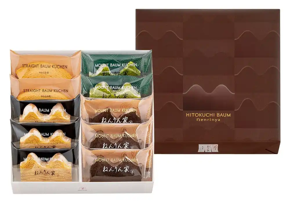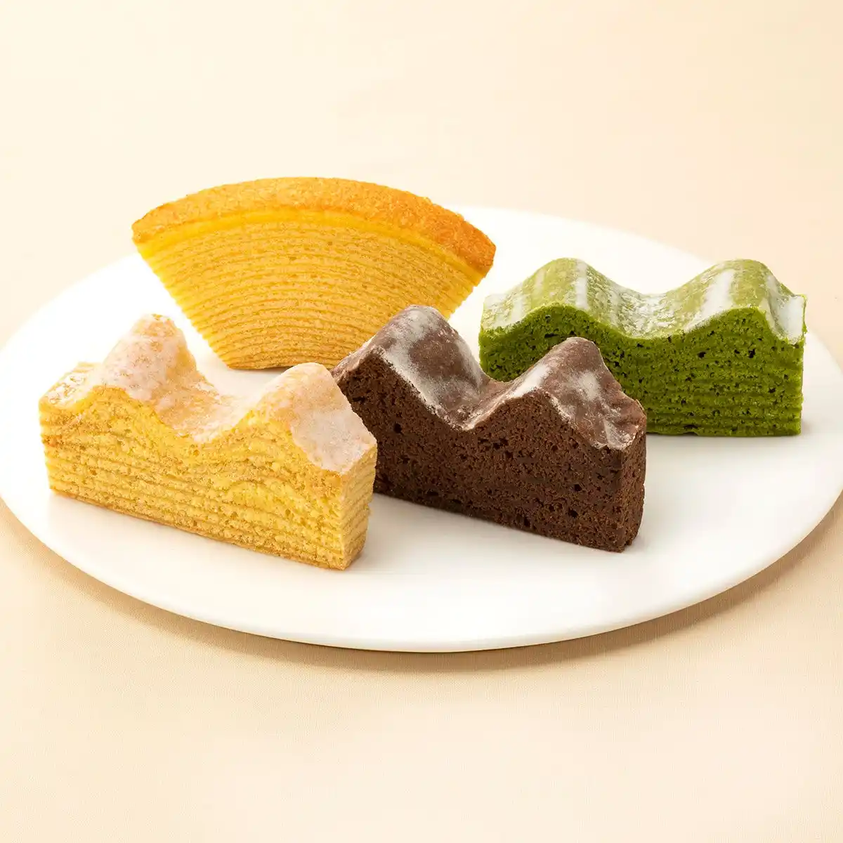 上質な味わいはそのままに、食べやすく上品なひとくちサイズのバームクーヘンです。2つの代表作『マウントバーム しっかり芽』『ストレートバーム やわらか芽』、冬限定『マウントバーム ブラウニー』、芳醇宇治抹茶香る『マウントバーム お抹茶』、4種の美味しさが勢ぞろい。 |