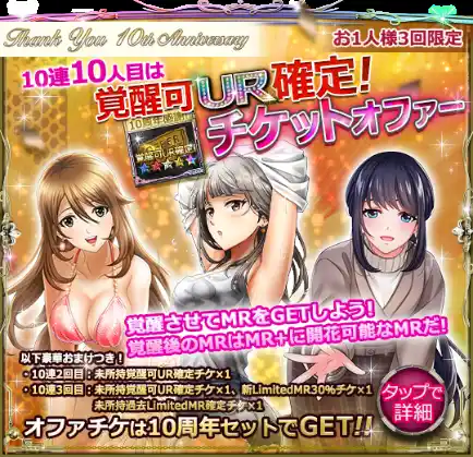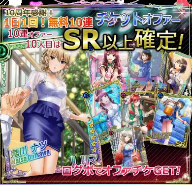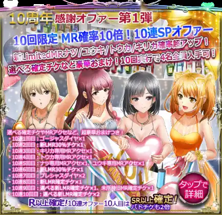 【10周年感謝!新LMRナツ/ユウキ/トウカ/キリカ含むMR全登場&確率10倍10連オファー 】 |