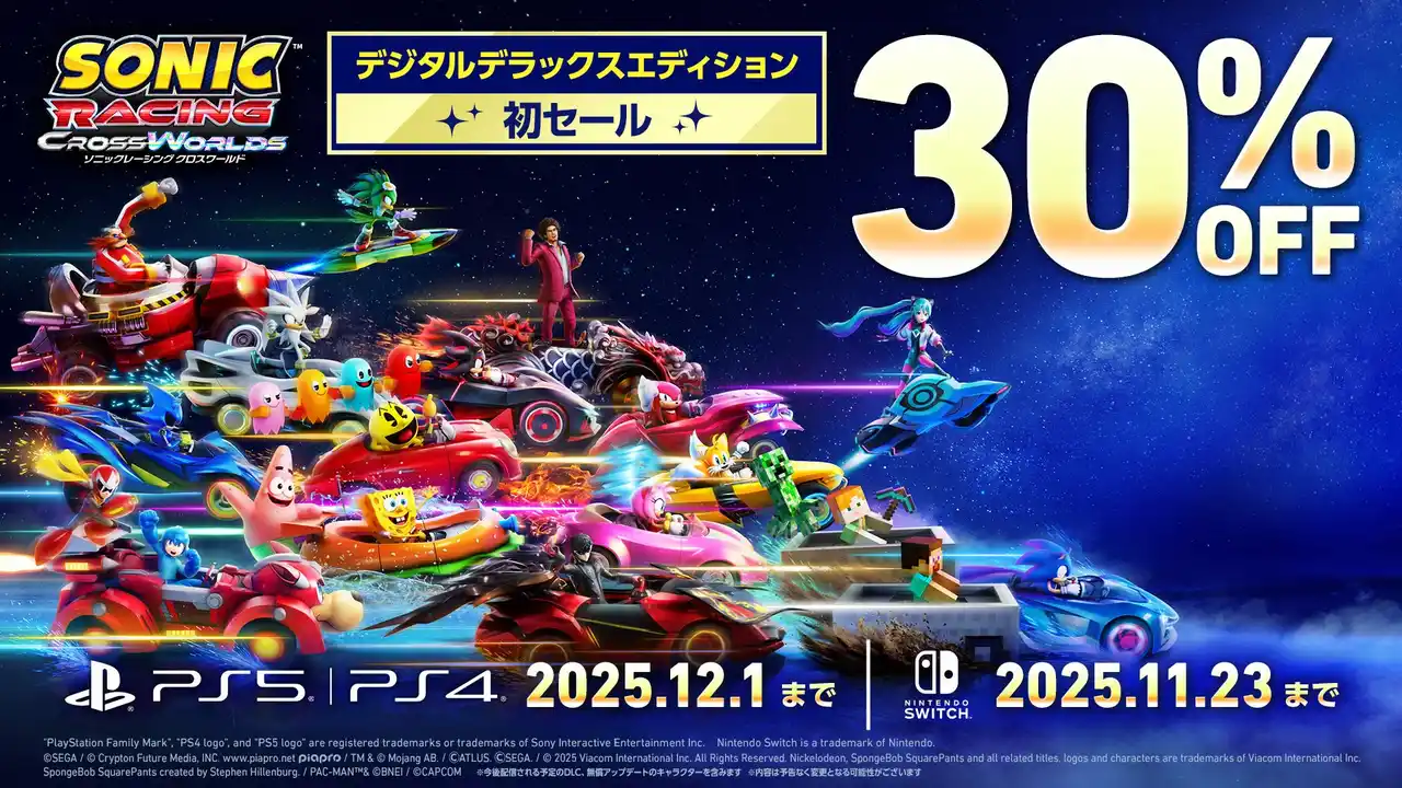 『ソニックレーシング クロスワールド』(PlayStation(R)5、PlayStation(R)4、Xbox Series X|S、Xbox Oneデジタルデラックスエディションが30%OFFとなるブラックフライデーセールを開催中です。デジタルデラックスエディションには、ゲーム本編に加え豪華コラボレーションDLCが含まれるシーズンパスがセットになっています。ぜひこの機会にお買い求めください。 |