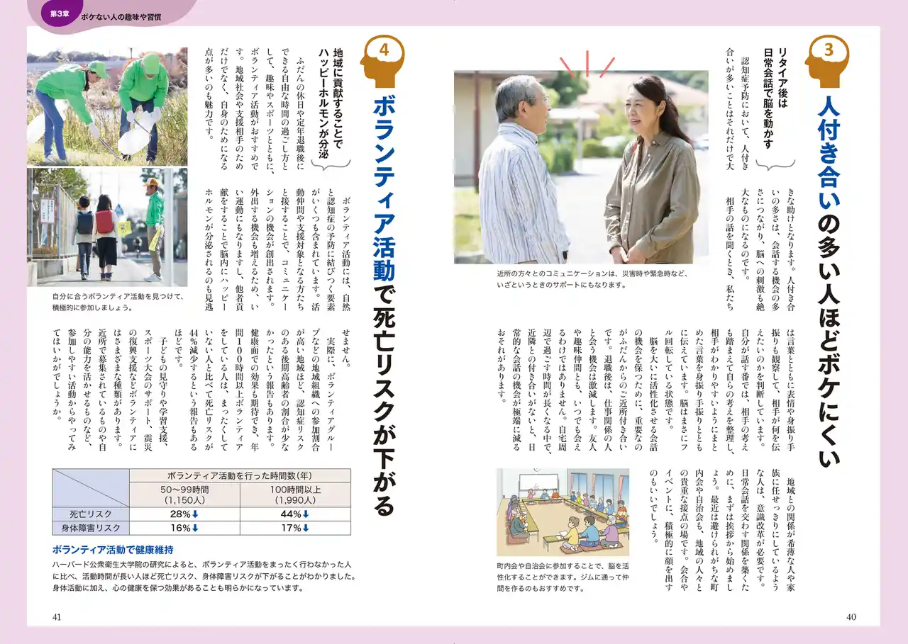 本誌はボケない人たちが実践している生活習慣の数々をわかりやすく紹介。実践することでさまざまな病気の予防にもつながり、充実した毎日を送れるようになります。 |