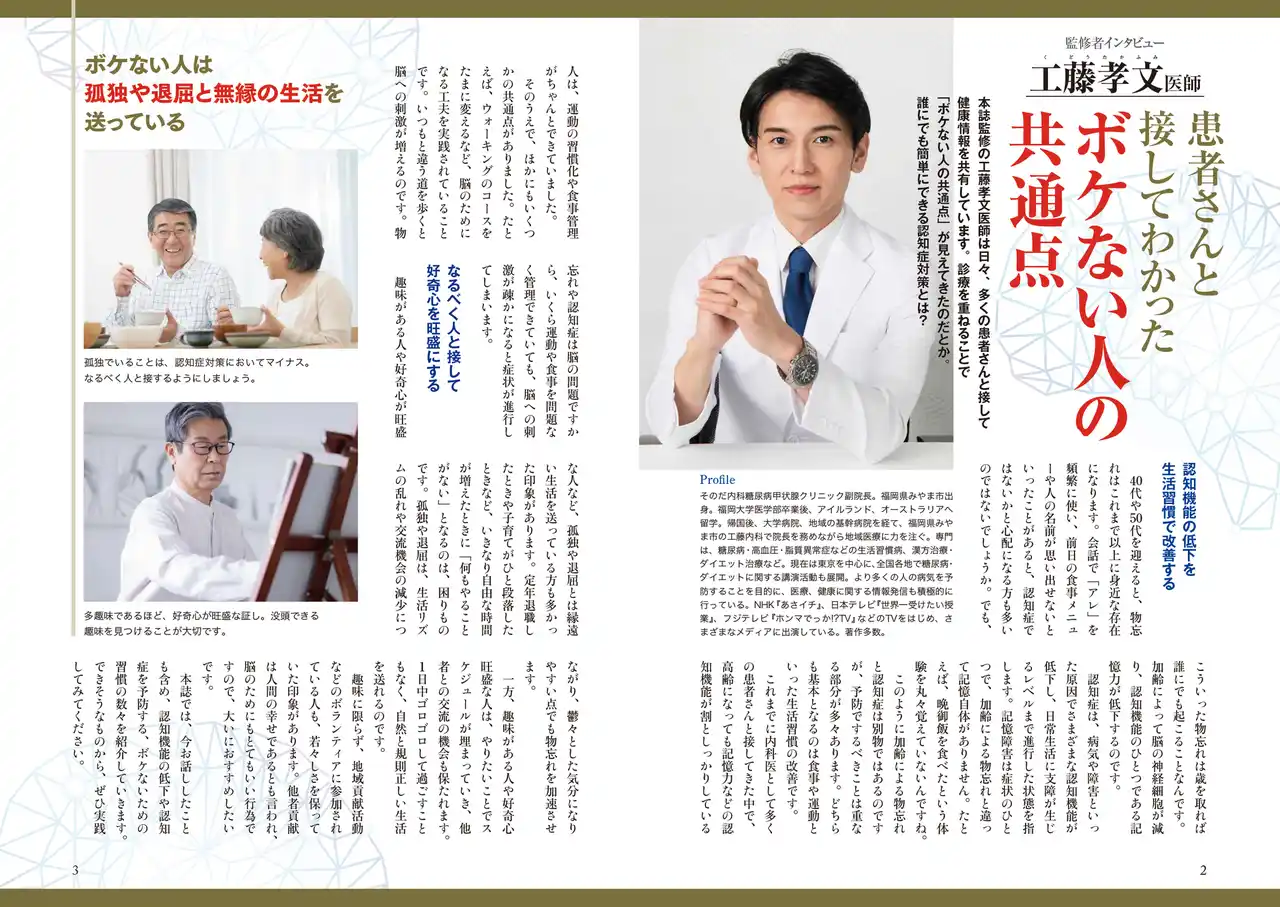本誌監修の工藤孝文医師は、多くの患者さんと接してきた経験から、「ボケない人たちの習慣が見えてきた」といいます。その習慣の数々を医療の現場で患者さんたちに伝え、メディアを通して発表しています。 |