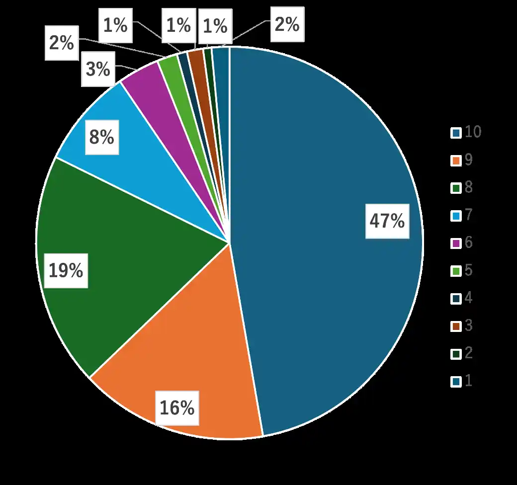 満足度調査では最高評価の"10"が47%、高評価と言える10~7までの評価で約90%を記録しており、多くの方に満足いただける結果となりました。 |