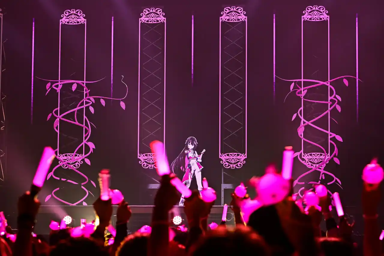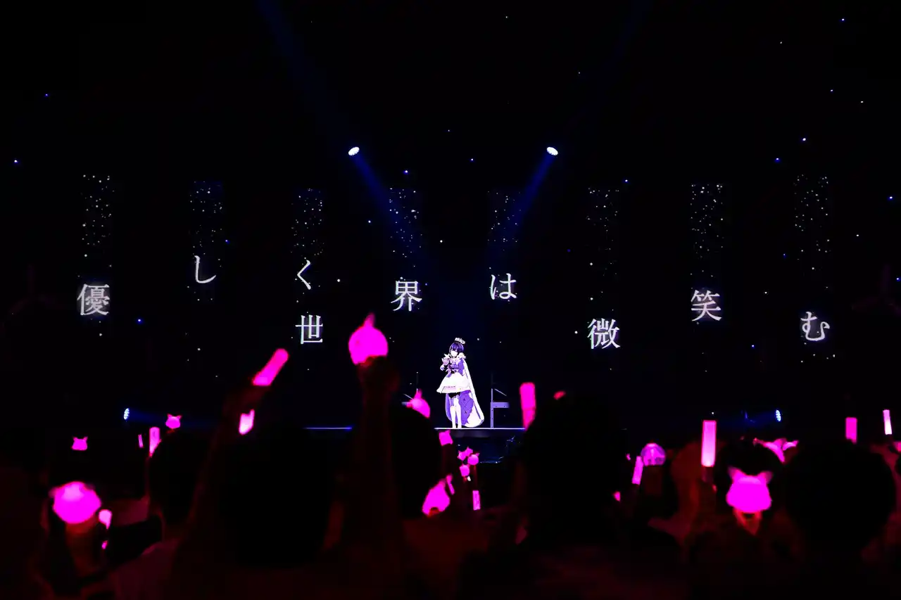 「この物語のエンドロールはまだまだ終わらないから」と伝えてはじまったのは、ルート分岐を経て辿り着いた今の世界線を象徴する楽曲「エンドロールは終わらない」。キービジュアルの衣装にふたたび着替えて、これまでの歩みや思いを詰め込んだような楽曲を熱唱すると会場に感動が広がっていく。続いて披露された代表曲のひとつ「いのち(2024 ver.)」では、初期からずっと歌い続けてきた楽曲を今の彼女ならではの表現で披露した。 |