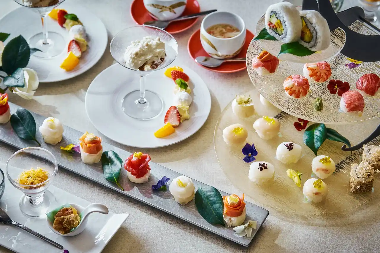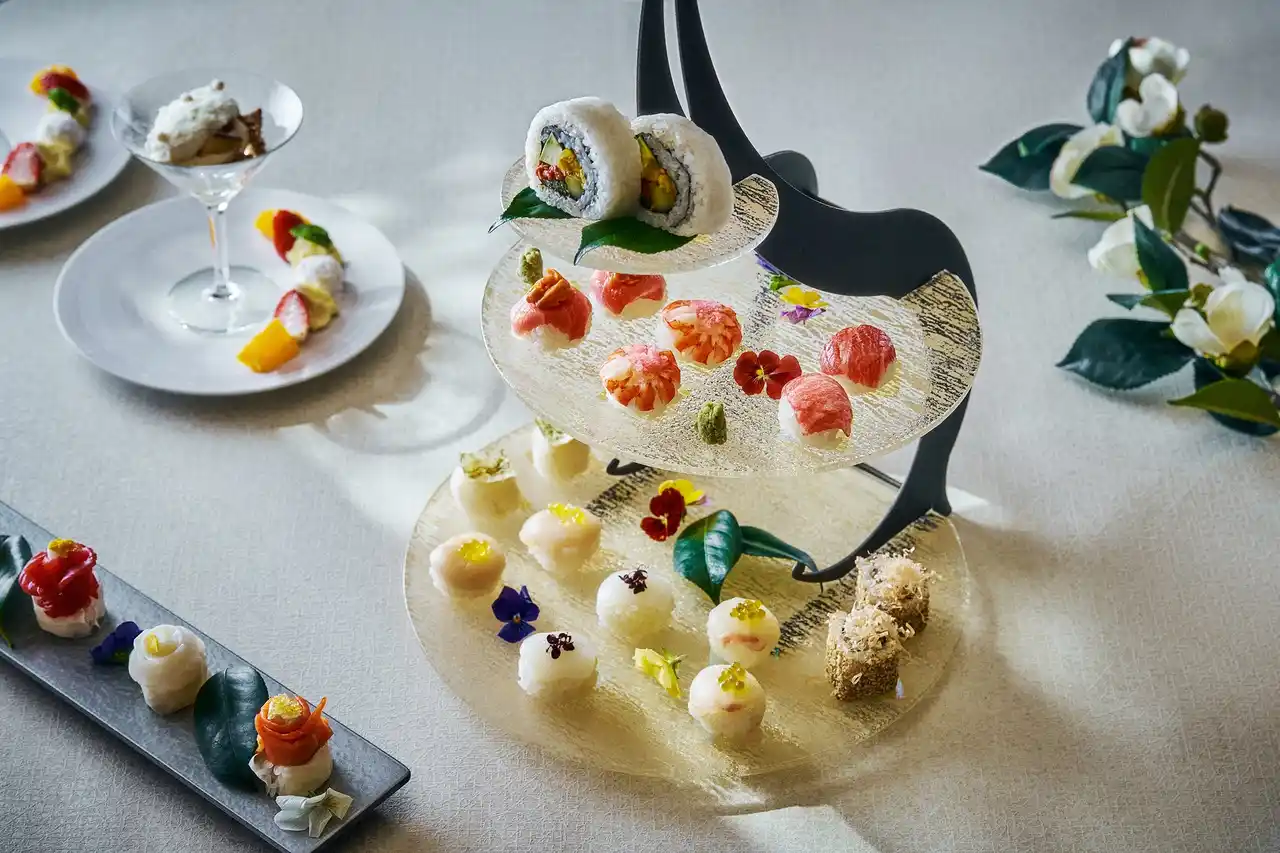 澄んだ空気と共に訪れる冬の季節。“冬の日本庭園”をテーマに、カレイやズワイ蟹など季節の味覚を存分に楽しめる和のアフタヌーンティーをご用意しました。寿司職人が冬の食材の魅力を巧みに引き出し、前菜、蒸し物、甘味まで、和の趣を重ねた味わいをお楽しみいただけるアフタヌーンティーです。 |