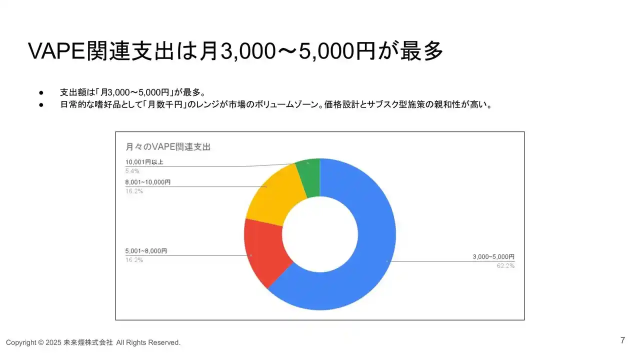 電子タバコブランド「VAPE X」を展開する未来煙株式会社は、全国のVAPE(電子タバコ)利用者を対象に実施した意識調査の結果をまとめた市場レポートである、「VAPE(電子タバコ)消費者動向調査レポート(2025年)」を公開しました。 本調査では、VAPEの利用実態・購買行動・フレーバー嗜好・健康意識などを多角的に分析し、日本市場における電子タバコ利用の“いま”を明らかにしています。 |