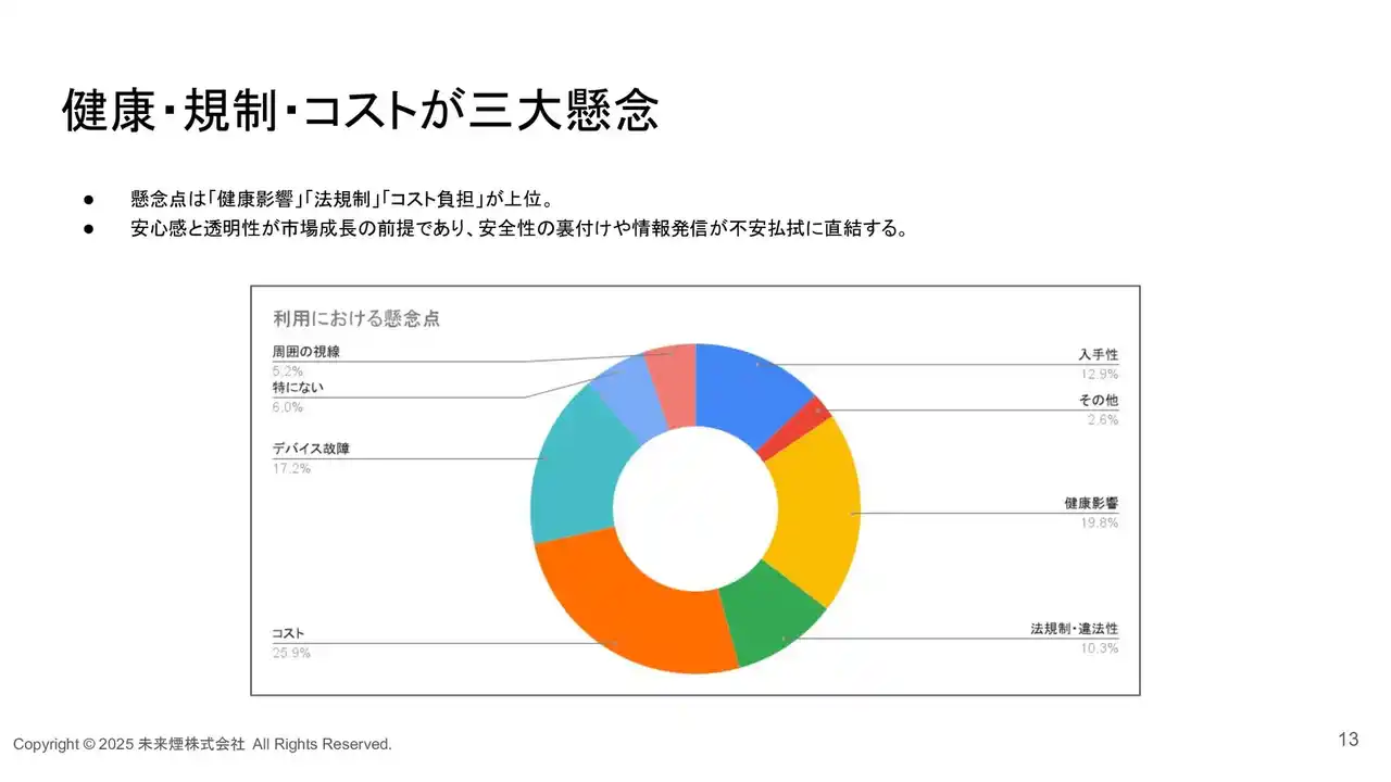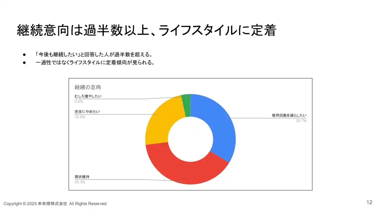 近年、紙巻きタバコ離れと健康志向の高まりを背景に、ニコチンフリーVAPEが新しいライフスタイルとして急速に浸透しています。 一方で、国内市場における「誰が、どんな理由で、どのようにVAPEを使っているのか」という実態データは乏しい状況でした。 未来煙株式会社は、電子タバコの安全・健全な普及を目的に、独自の全国調査を実施。結果をレポートとして公開することで、業界関係者やメディアが引用可能な一次情報を提供しています。 |