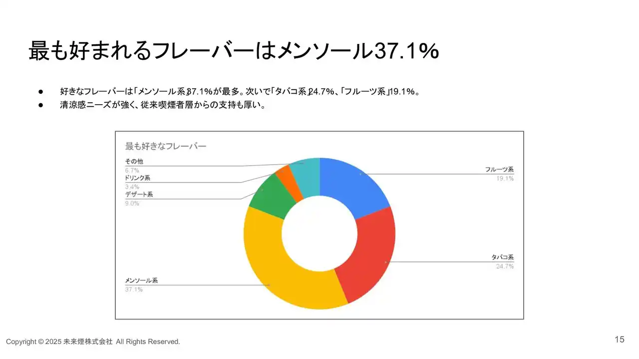 次点はタバコ系(24.7%)、フルーツ系(19.1%)。清涼感ニーズが依然強く、従来喫煙者層の支持が厚い。 |