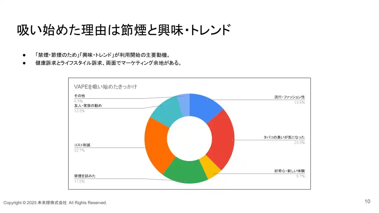 節煙・禁煙補助としての利用が最多。VAPEが“我慢ではなく置き換え”の手段として支持を拡大。 |