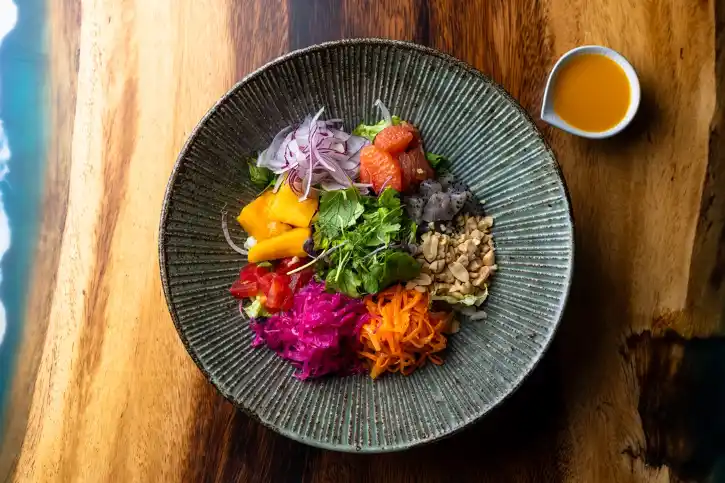 シャキシャキとした青パパイヤに、熟れたマンゴーのやわらかな甘み、唐辛子とライムの爽やかな酸味が絶妙に調和した、タイを代表するスパイシーサラダ。一口ごとに広がるフレッシュな香りが、食欲を呼び覚まします。 |