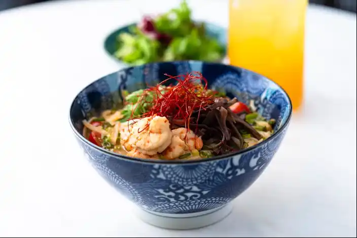 海老の旨みをぎゅっと閉じ込めたトムヤムスープで米麺を煮込んだ一杯。仕上げにパクチーをたっぷりと添え、酸味と辛味のバランスがクセになる人気メニュー。立ちのぼるスパイスの香りが食欲を刺激します。(パクチーの有無、別添えも選択いただけます) |