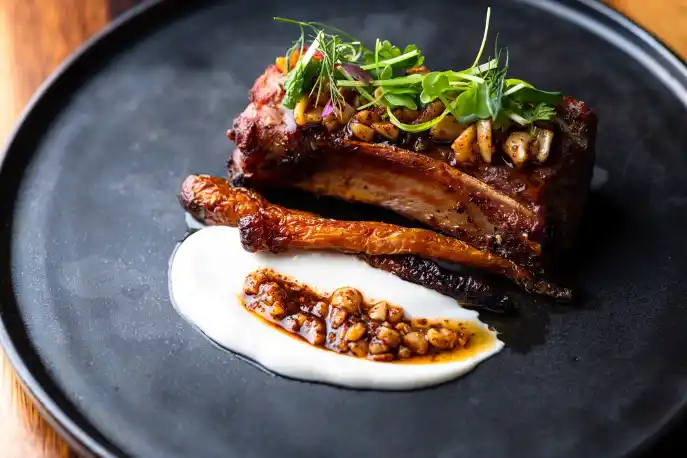じっくりと火を入れたスペアリブの旨みとローストした人参のやさしい甘みに、香ばしいタヒニ風ソースがとろりと絡み、コクと深みが重なるリッチな味わいが楽しめる一皿です。 |