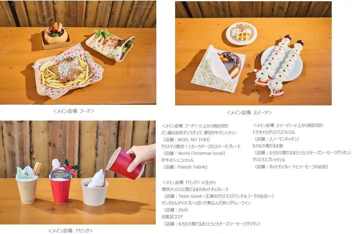 メイン会場内には61店舗の飲食・物販ブースが集結。クリスマス気分を盛り上げるシチューやホットココア、ホットチョコレートに加え、クリスマスマーケットの本場・ドイツで親しまれるシュニッツェルやグリューワインも登場します。思わず写真に収めたくなる、愛らしいクリスマスデコレーションも必見です。 |