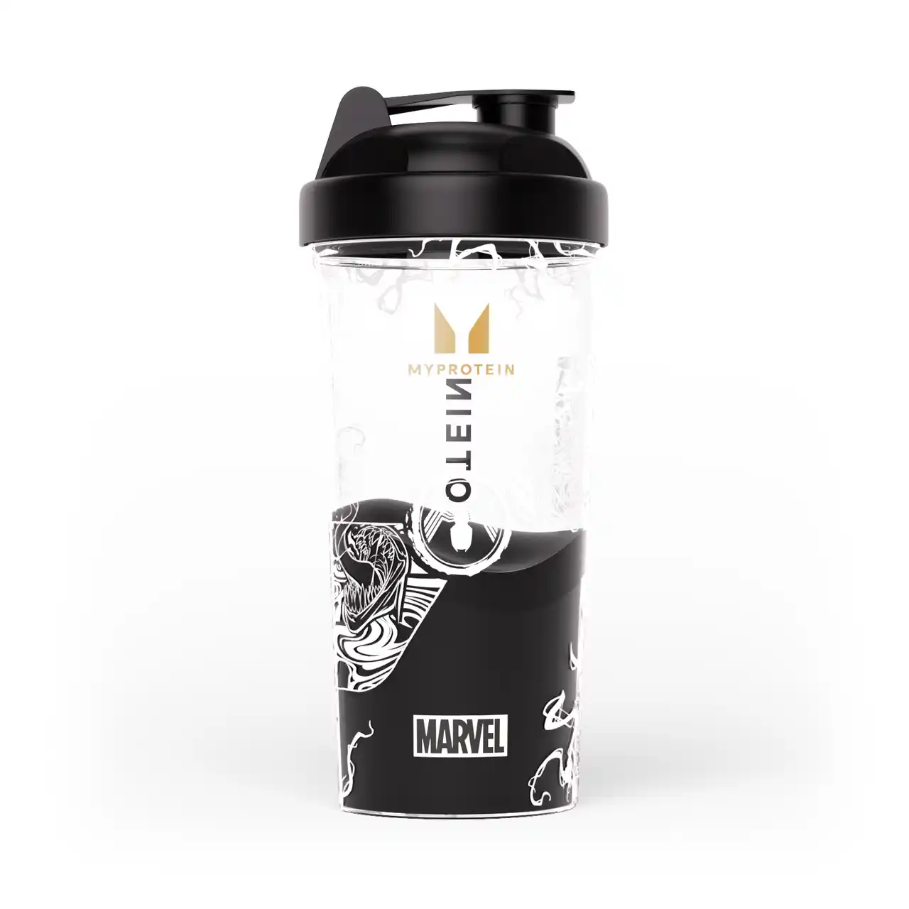 漆黒のプレワークアウトを引き立たせる、透明な、「MARVEL ヴェノム プラスチックシェイカー」。スムーズに混ぜられるブレンディングボール付き600mlのシェーカーです。 |