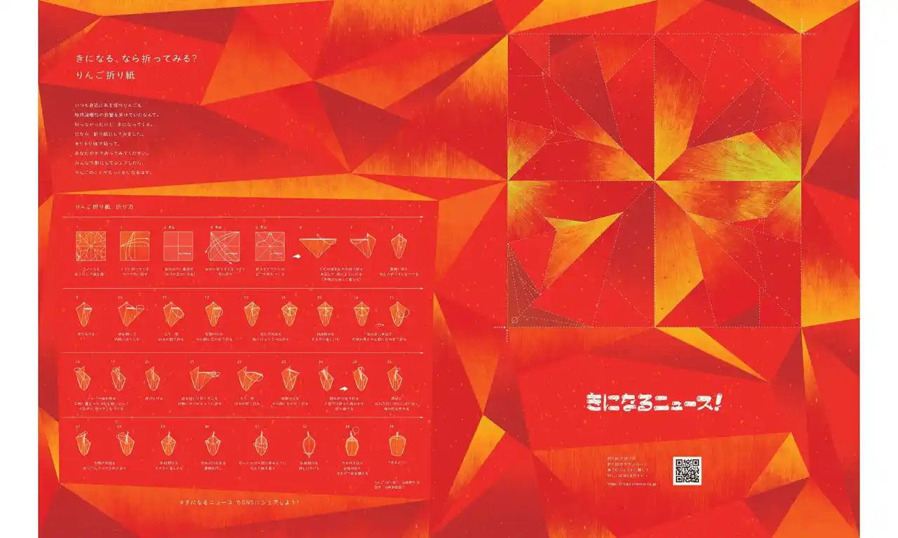 11月26日付信濃毎日新聞紙面に「りんご折り紙」を掲載します。暖色の幾何学模様のページをキリトリ線に沿って切り、折り方イラストの手順に沿って折っていただくと、なんと!りんごができ上がります! |