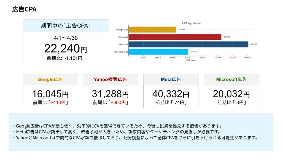 本レポートでは、媒体ごとの広告CV数やCPAといった主要指標の前期間比較に加え、AIが「Facebook広告がCV数を伸ばしている」「Meta広告はCPAが高い」といった傾向を自動で分析し、テキストで考察を提示します。 |