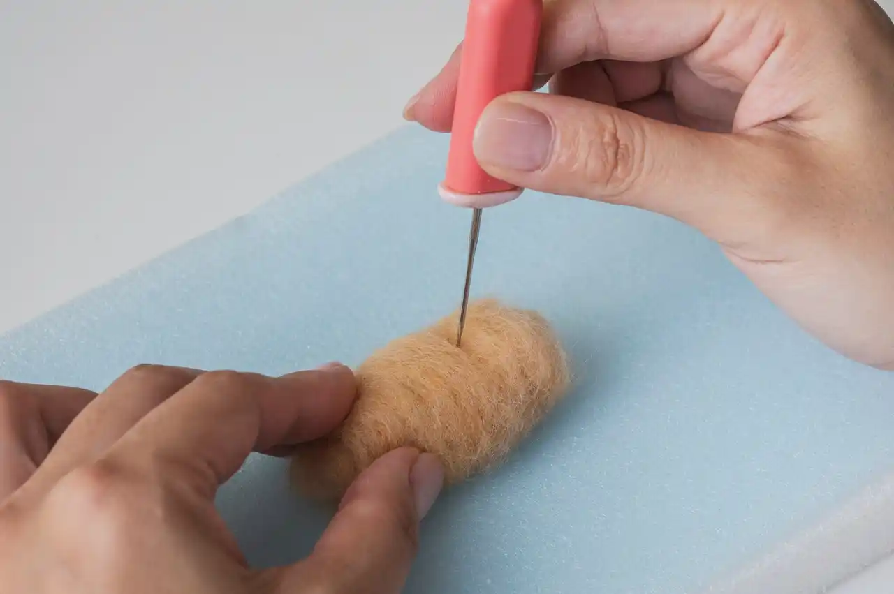 <ニードルフェルト> 専用針でさくさくと羊毛を刺し、フェルト化させます。本書ではかぶりものに模様をつけたり、耳などのパーツを作ったりします。 |