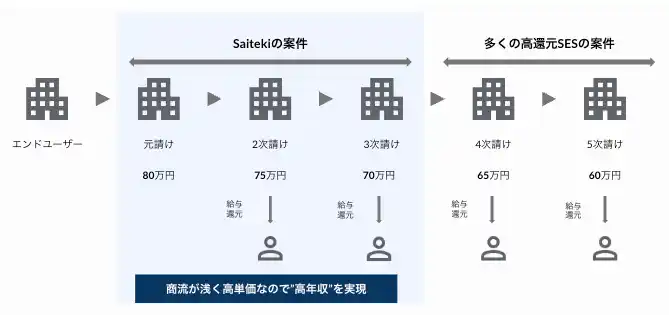 | 会社負担の社会保険料含む「還元率」は業界最高水準である78~83%(給与還元率は65~70%)です。業界経験豊富でクライアントワークが得意な営業メンバーで構成することで元請・2次請直の"比較的商流が浅い案件"の獲得に成功しているため、受注単価が高く、「高還元」のみならず「高年収」を実現しています。 | |||||||||