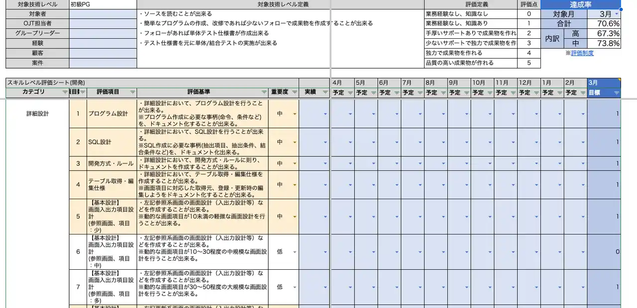 | SE・PGそれぞれについて100項目を超えるスキル評価シートを完備しています。自身のスキルの現在地を把握し、エンジニアとしてキャリアアップするために"いまやるべきこと"を正確に割り出して、エンジニア出身のSES営業のフォローをもとにキャリアアップを実現することができます。さらにキャリアアップに応じて年収アップも明確な報酬体系を元に実現させています。 | |||||||||