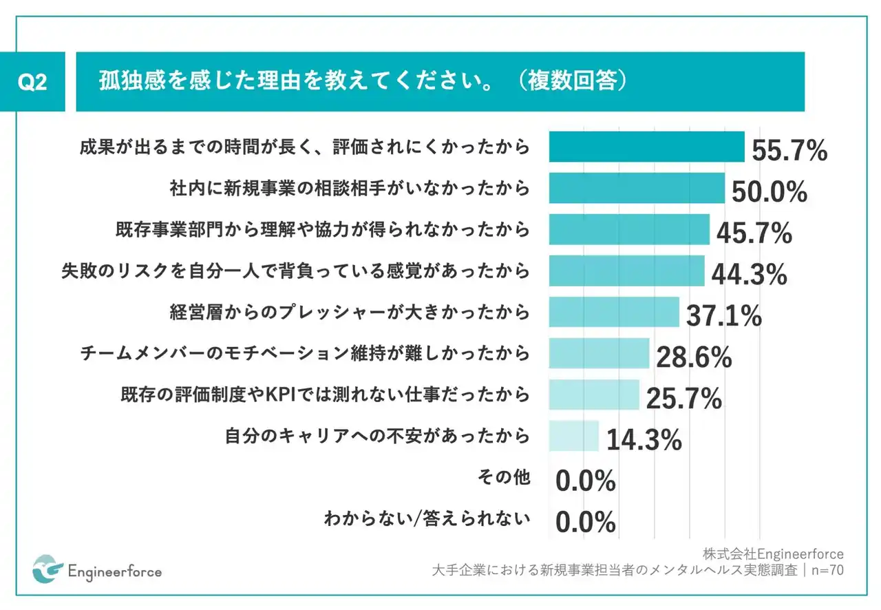 Q1で「頻繁に感じた」「時々感じた」と回答した方に、「Q2.孤独感を感じた理由を教えてください。(複数回答)」(n=70)と質問したところ、「成果が出るまでの時間が長く、評価されにくかったから」が55.7%、「社内に新規事業の相談相手がいなかったから」が50.0%、「既存事業部門から理解や協力が得られなかったから」が45.7%という回答となりました。 |