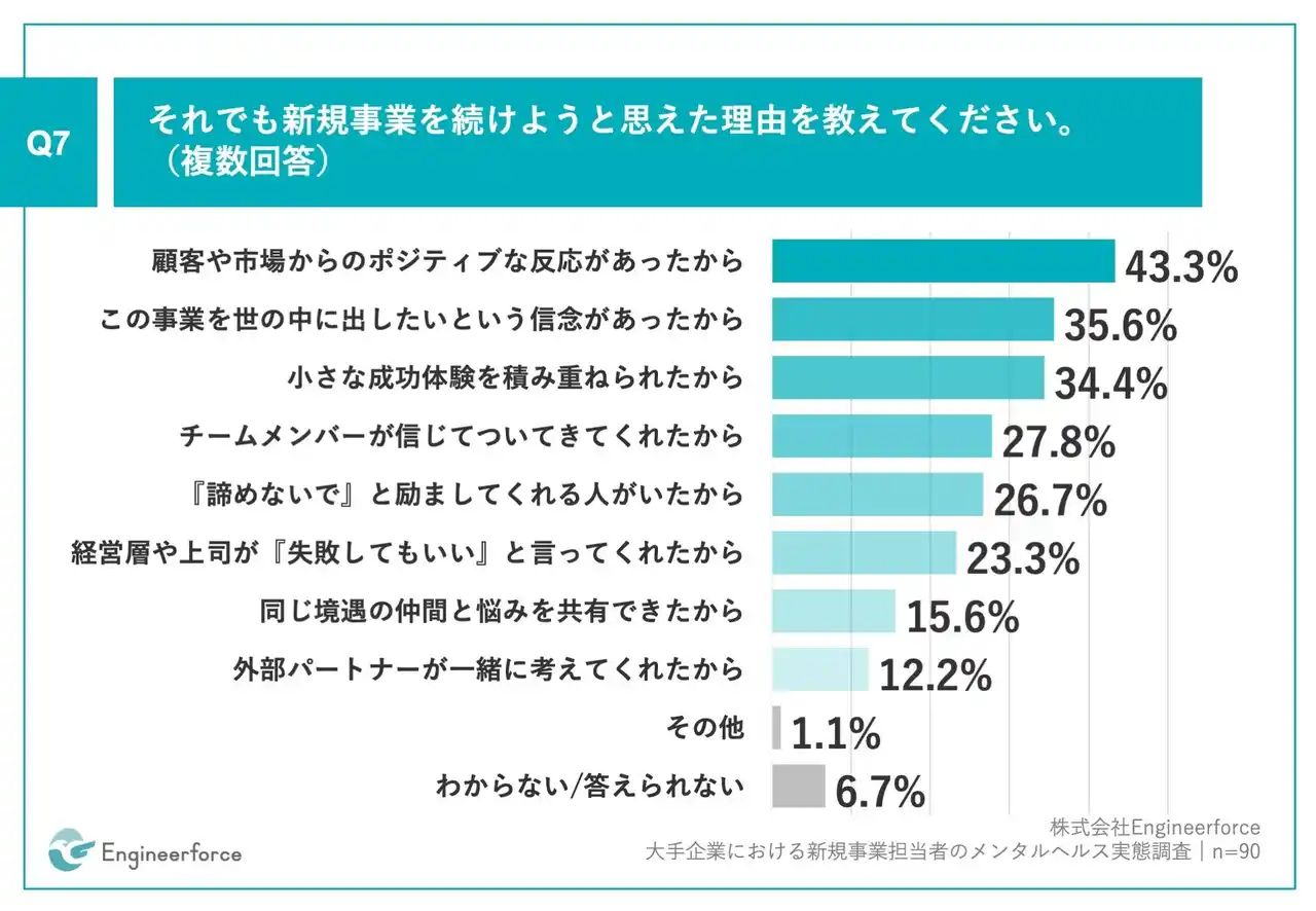 Q4で「何度もあった」「数回あった」「1回だけあった」と回答した方に、「Q7.それでも新規事業を続けようと思えた理由を教えてください。(複数回答)」(n=90)と質問したところ、「顧客や市場からのポジティブな反応があったから」が43.3%、「この事業を世の中に出したいという信念があったから」が35.6%、「小さな成功体験を積み重ねられたから」が34.4%