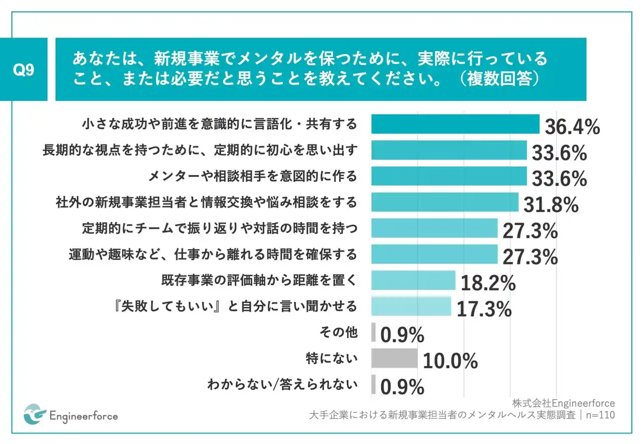 「Q9.あなたは、新規事業でメンタルを保つために、実際に行っていること、または必要だと思うことを教えてください。(複数回答)」(n=110)と質問したところ、「小さな成功や前進を意識的に言語化・共有する」が36.4%、「長期的な視点を持つために、定期的に初心を思い出す」が33.6%、「メンターや相談相手を意図的に作る」が33.6%という回答となりました。 |