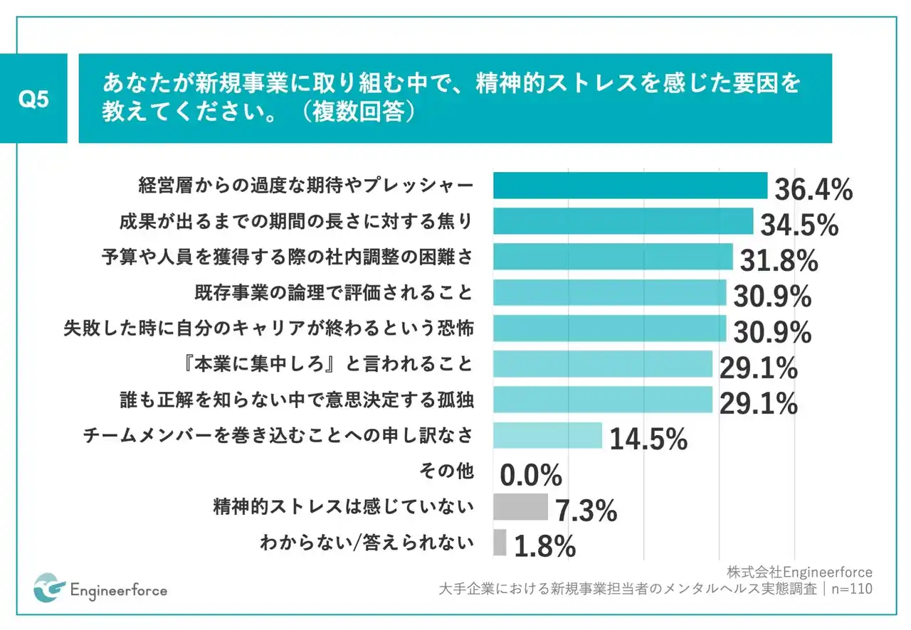 「Q5.あなたが新規事業に取り組む中で、精神的ストレスを感じた要因を教えてください。(複数回答)」(n=110)と質問したところ、「経営層からの過度な期待やプレッシャー」が36.4%、「成果が出るまでの期間の長さに対する焦り」が34.5%、「予算や人員を獲得する際の社内調整の困難さ」が31.8%という回答となりました。 |