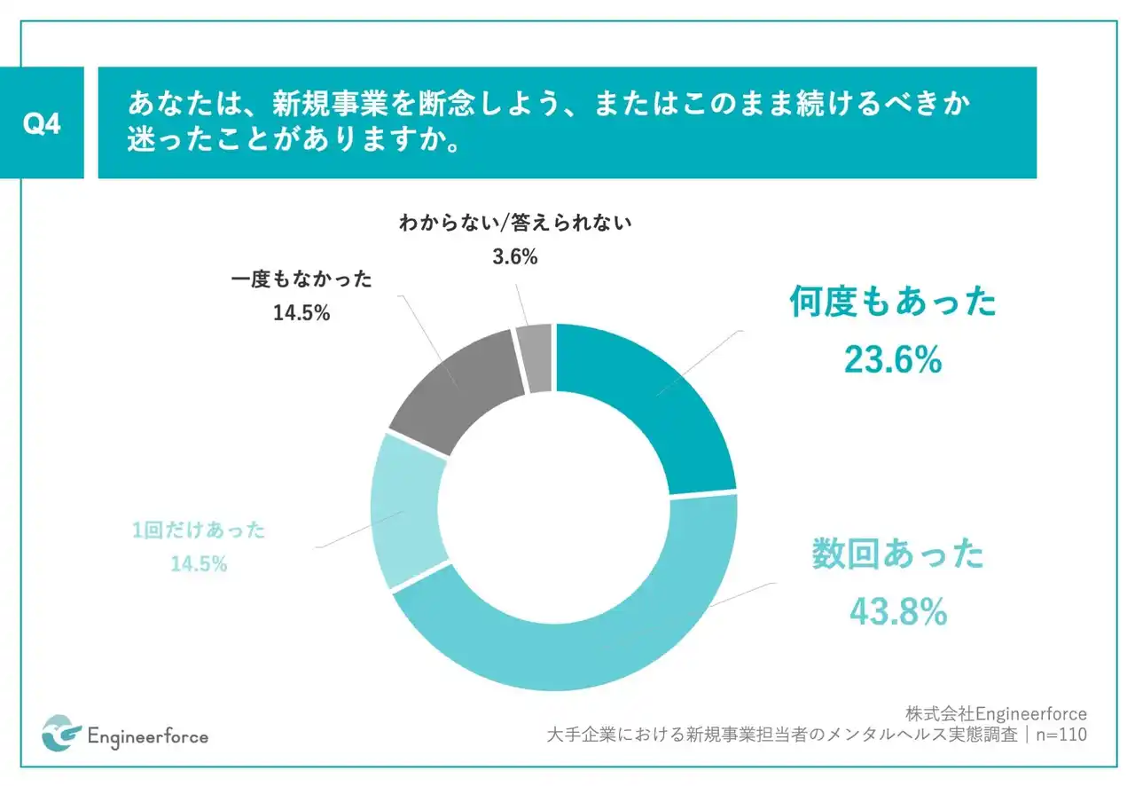 「Q4.あなたは、新規事業を断念しよう、またはこのまま続けるべきか迷ったことがありますか。」(n=110)と質問したところ、「何度もあった」が23.6%、「数回あった」が43.8%という回答となりました。 |