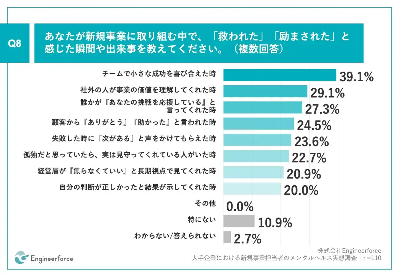 「Q8.あなたが新規事業に取り組む中で、「救われた」「励まされた」と感じた瞬間や出来事を教えてください。(複数回答)」(n=110)と質問したところ、「チームで小さな成功を喜び合えた時」が39.1%、「社外の人が事業の価値を理解してくれた時」が29.1%、「誰かが『あなたの挑戦を応援している』と言ってくれた時」が27.3%という回答となりました。 |