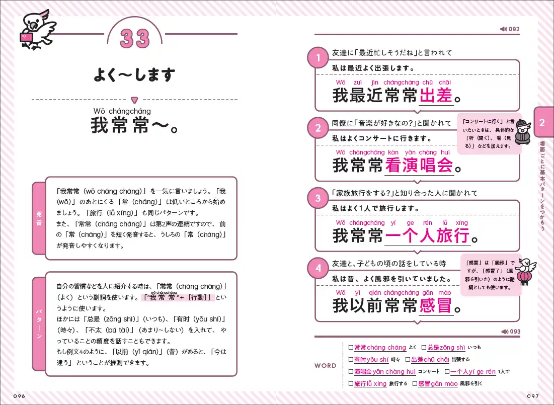 1つのパターンに複数の例文付き。例文にはすべて「現地で、その言語で話す」場面を想定した設定文が付いています。ビジネス、旅行、留学などさまざまな場面を想定して、実践的なトレーニングができます。 |