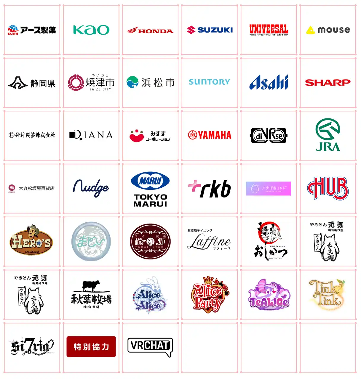 交通基盤部未来まちづくり室/静岡県焼津市/静岡県浜松市/サントリー株式会社/アサヒ飲料株式会社/シャープ株式会社/仲村製茶株式会社/ダイアナ株式会社/株式会社みすずコーポレーション/ヤマハ発動機株式会社/株式会社diVRse/日本中央競馬会(JRA)/株式会社大丸松坂屋百貨店/ナッジ株式会社/株式会社東京マルイ/RKB毎日放送/OTAGROUP株式会社(メタばあちゃん)/株式会社ハブ/HERO'S ステーキハウス 秋葉原店/シーシャBAR まどい/メイド喫茶橙幻郷/秋葉原ダイニング ラフィーネ/やきとん元気グループ/焼肉酒場 秋葉牧場/コンセプトカフェ Alice×Aliceグループ |