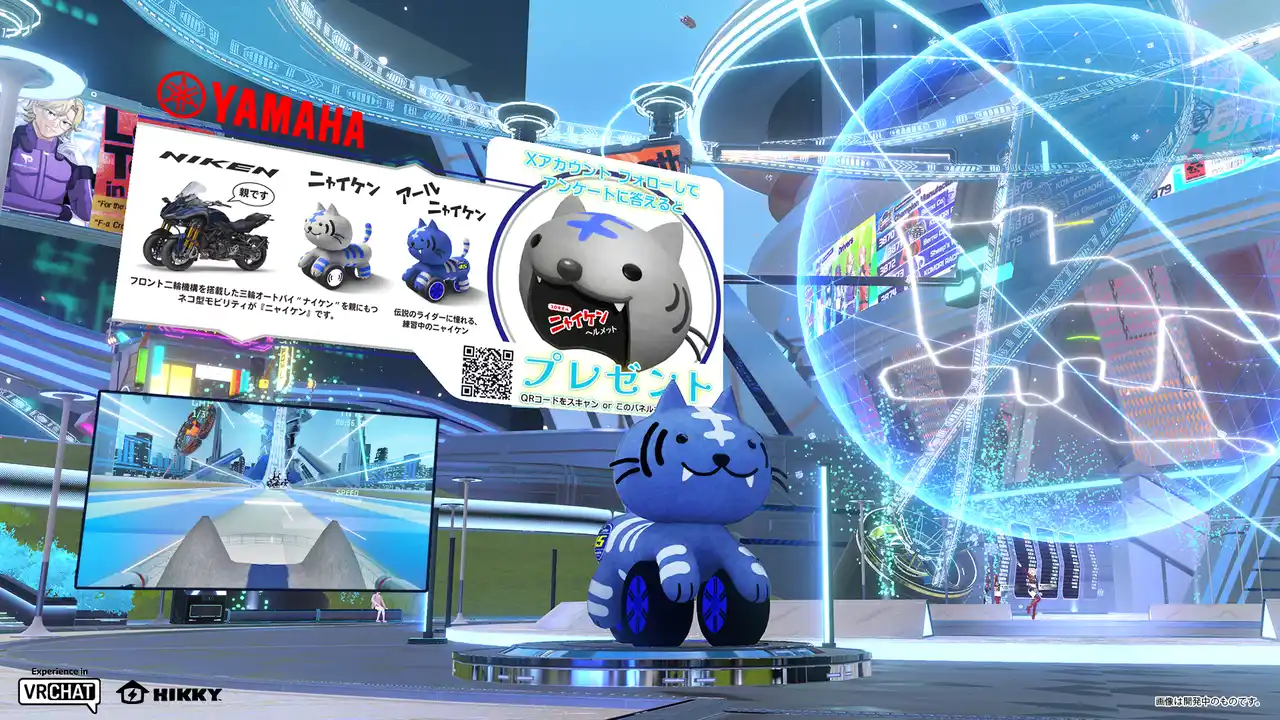8度目の出展となるヤマハ発動機株式会社は、今回初めて一般出展ワールドに協賛出展!「Vketフォーミュラ.3879 グランドファイナル!」の会場にて、大型三輪バイク「NIKEN」を親にもつネコ型モビリティ『ニャイケン』に乗って、超未来型レースに参加できます。さらに会場内に設置されたミニブースでは、ニャイケンの3Dモデルの展示のほか、ヤマハ発動機公式X(ヤマハ バイク)をフォローして、ブース内のアンケートを回答した方全員に、ニャイケンヘルメット3Dモデルをプレゼントします。 |