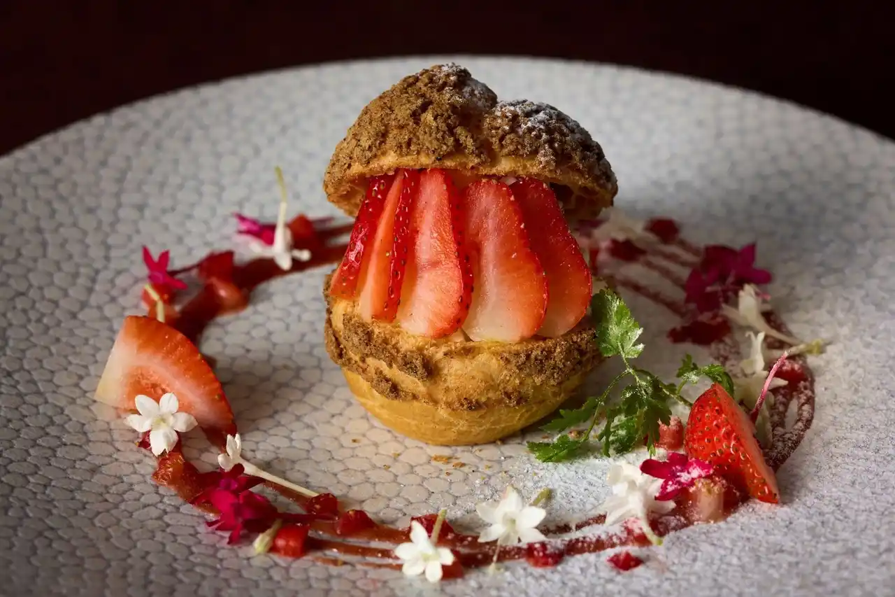お客様のシーンに合わせて、メインの組合せが自由に選べる全8品のプリフィックスディナーコース。海と山の恵みや、紅ずわい蟹の鉄鍋雑炊、ホテルオリジナル米「SORANO米」を使った立川産苺のクッキーシューをデザートにご用意し、冬の味覚満載です。(13,200円 税込~) |