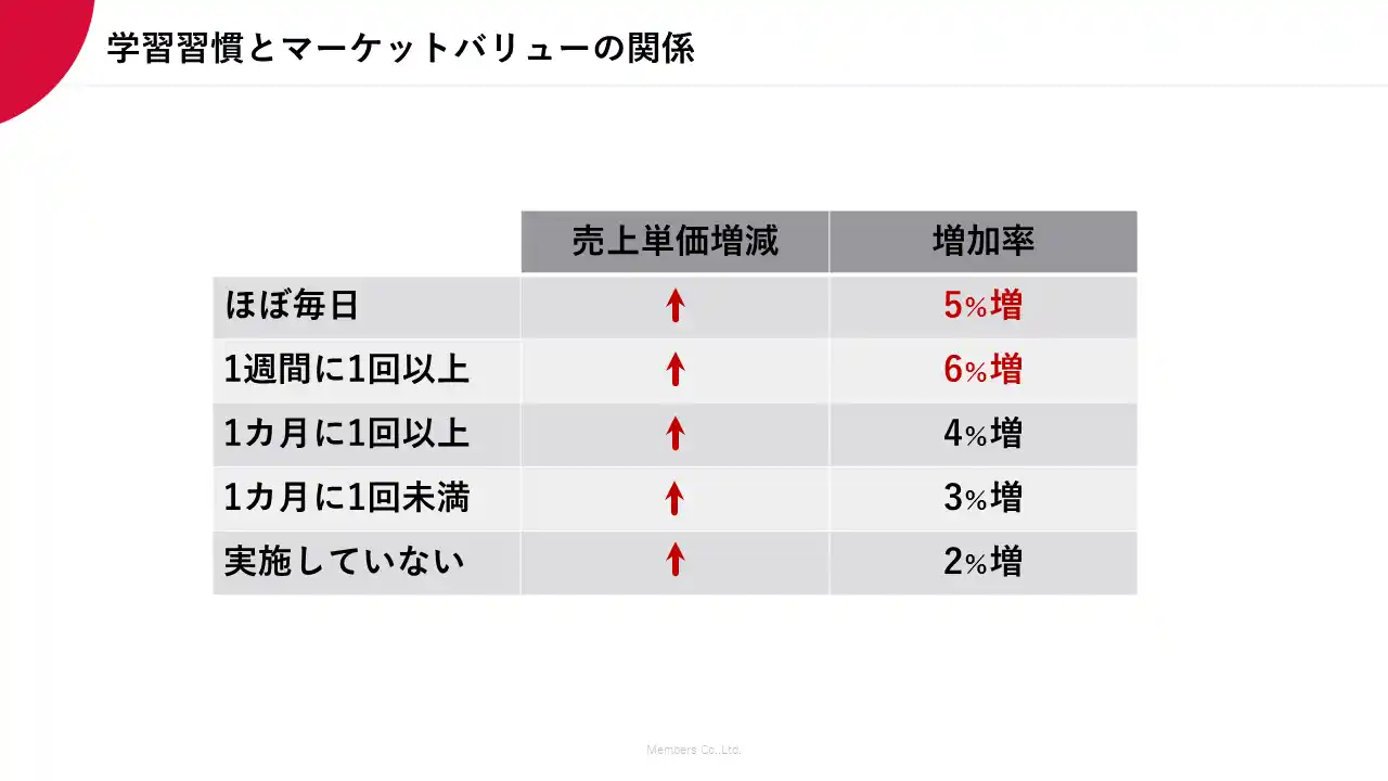 学習頻度が高いほど、一人当たりの売上単価が向上。マーケットバリューが高まっていることがうかがえる。 |