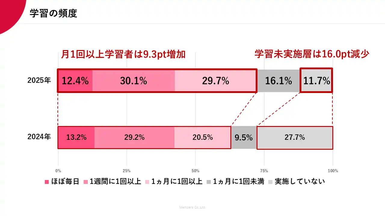 学習を実施していない層が16.0pt減少、1カ月に1回以上は9.3pt増加。1年間で何らかの学習をスタートした社員数が大きく増加。 |