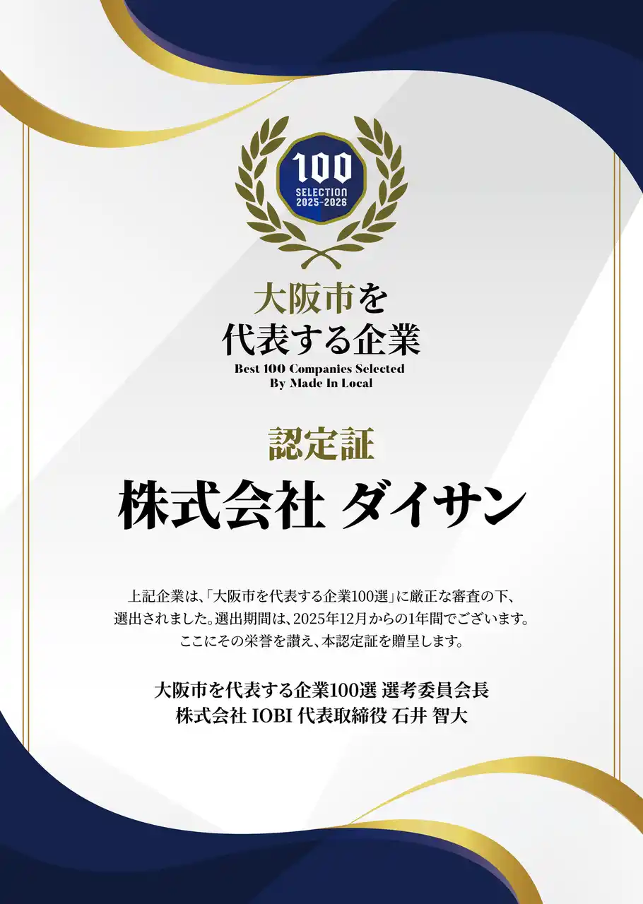 株式会社ダイサン(代表取締役社長:藤田武敏)は、地方創生メディア「Made In Local」が主催する全国各地の地域経済を牽引する企業を選出するプロジェクト「地域を代表する企業100選」において、「大阪市を代表する企業100選」に選出されました。パーパス「人と現場を守り抜く」のもと、社会の持続と発展に貢献してまいります。 |