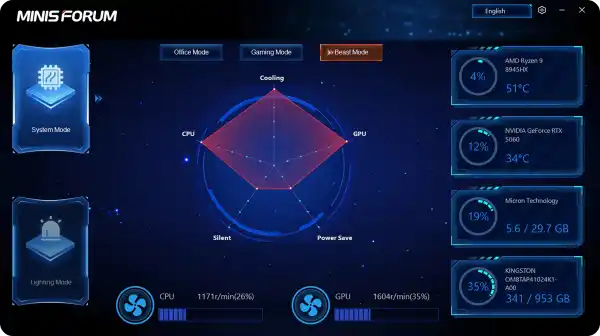 DP/HDMIポートを組み合わせた最大4画面出力に対応します。専用コントロールセンターにより、パフォーマンスモード(オフィス/ゲーム等)やRGBライトを自由にカスタマイズ可能です。