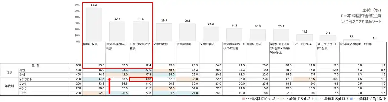 コミュニケーションの相手として、「情報の収集」(55.3%)「自分自身の悩み相談」(32.6%)「日常的な会話や雑談」(32.4%)といった活用が多く、年代が若いほどその傾向が強い |