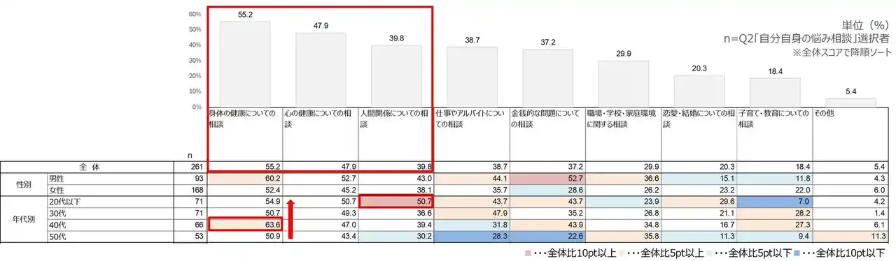 相談内容は年代によって偏りがみられ、『身体の健康についての相談』は40代が63.6%で全体より5pt以上高く、『人間関係についての相談』は20代以下が50.7%で全体より10pt以上高かった。 |