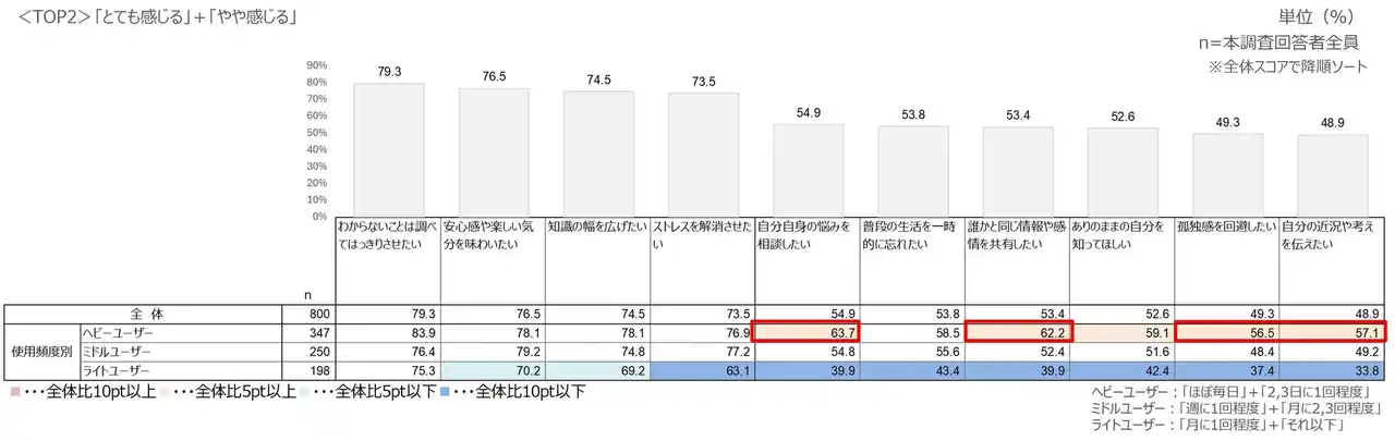 各コミュニケーション欲求について、「とても感じる」「やや感じる」を選択した人の合計をChatGPTの使用頻度別でみると、『安心感や楽しい気分を味わいたい』『ストレスを解消させたい』を除いた8項目で、使用頻度が上がるにつれ高くなっていた。 |