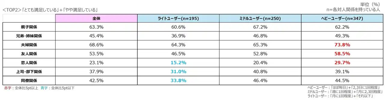 各対人関係の満足度について、「とても満足している」「やや満足している」を選択した人の合計を使用頻度別でみると、いずれの対人関係もヘビーユーザーがライトユーザーよりも高かった。 |