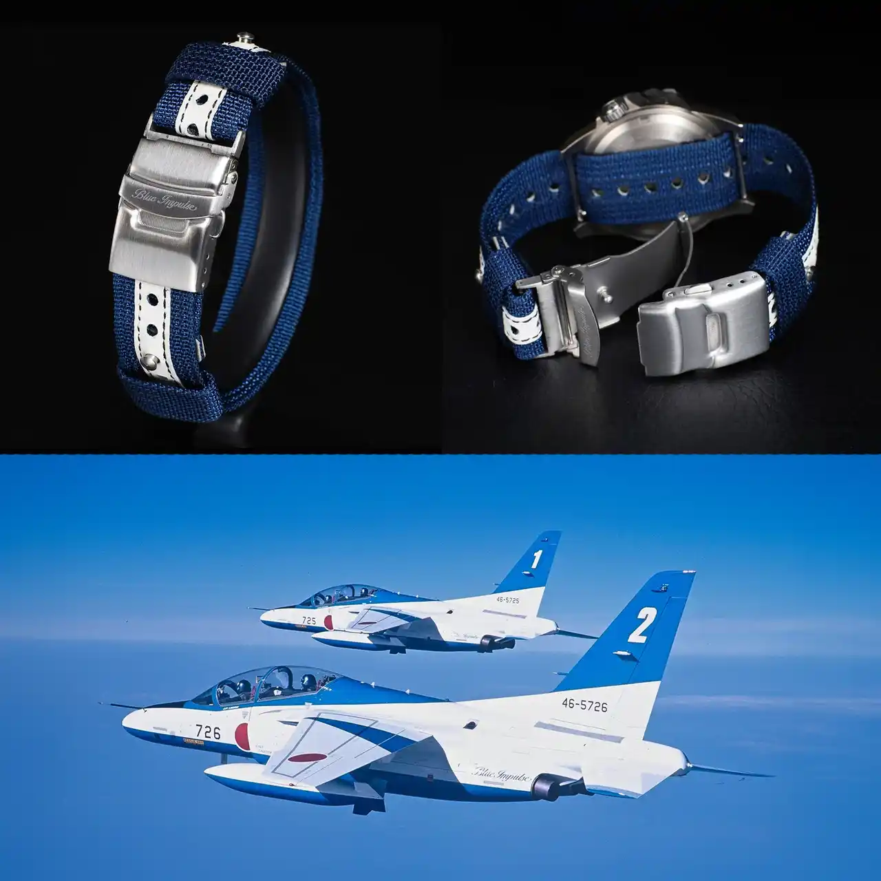交換用ベルトとして、ブルーインパルスの機体カラーをイメージした、ブルーxホワイトのナイロンベルトを付属。リベットの留め穴部分には革の補強を施し、耐久性を高めています。バックルには着脱しやすい三つ折れ式バックルを採用。さらに、ベルトは専用工具不要のピンレバー方式で、シーンに合わせてお客様ご自身で簡単に交換が可能です。 |